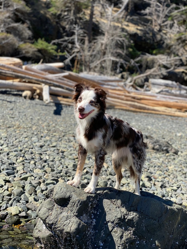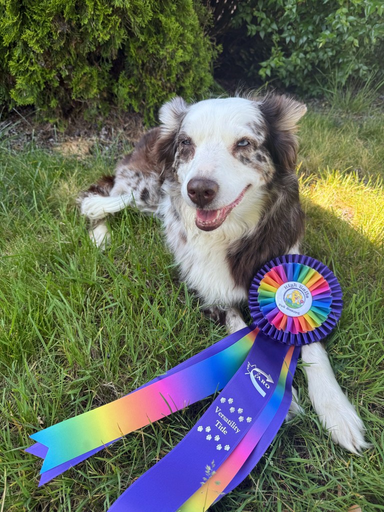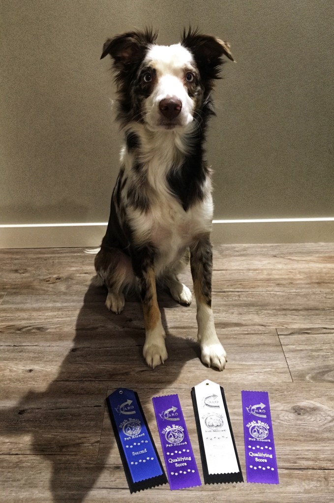 Story’s main focus is disc. She dabbles in Rally O and Barn Hunt as well. We train in Agility regularly and she’s pretty solid in the sport as she is a champion in the disc/agility cross over competitions. She plays Scent Detection for fun as well. Story’s biggest achievement is her ability to go to work with James daily. She visits construction sites, an office and helps with clients. She also works with Jade in her dog training programs and helps dog who struggle with reactivity, fear or just developing dog t o dog skills. She’s an overall lovely girl that we can take anywhere and trust her completely on or off leash.